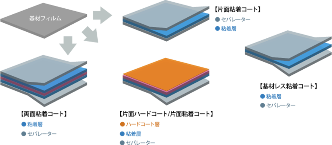 粘着、ハードコート、易接着(接着しやすい性質)など、フィルム素材の表面に様々な機能を持つ樹脂を塗布します。